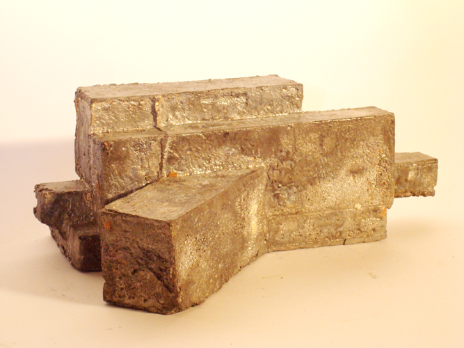 Installatie Places of Worship and Industry.- Installatie bestaande uit 8 loden beelden, 8 bijbehorende gipsen mallen, samenstelling van 3 modellen in hout en was, alles op bijbehorende constructie van betonijzer met hardhouten blad. Tevens 3 bijbehorende krukjes in betonijzer en hardhout. h150b350d200