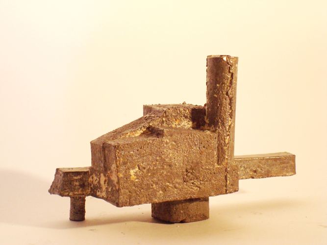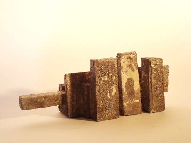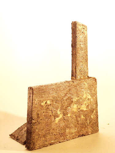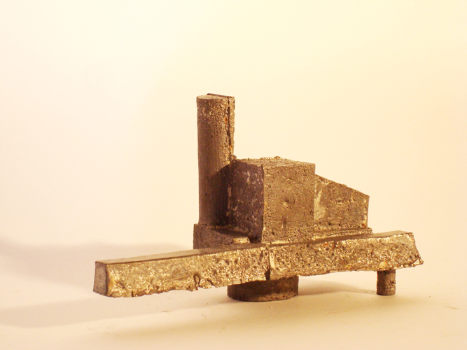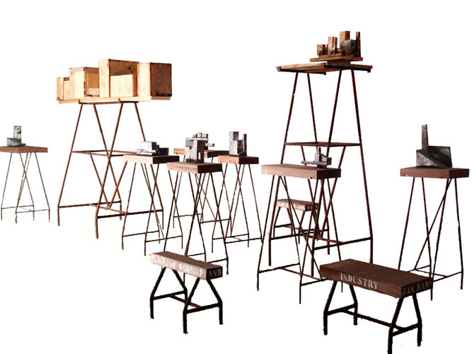 Installatie Places of Worship and Industry.- Installatie bestaande uit 8 loden beelden, 8 bijbehorende gipsen mallen, samenstelling van 3 modellen in hout en was, alles op bijbehorende constructie van betonijzer met hardhouten blad. Tevens 3 bijbehorende krukjes in betonijzer en hardhout. h150b350d200